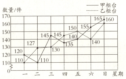(1)甲、乙两个柜台星期几销售的儿童服装相差的件数最多?星期几相差的最少?