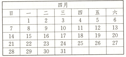 5. 小红的爸爸和妈妈都在公交公司工作。小红的爸爸每隔3天上1次晚班,妈妈每隔5天上1次晚班。某年的4月27日,小红的爸爸和妈妈正好同时上晚班。4月几日两人也同时上晚班?请在下面的月历表中圈一圈。