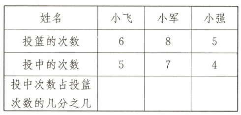 5. 小飞、小军、小强三人一起玩投篮游戏,他们投篮的次数和投中的次数见下表。谁投得最准?