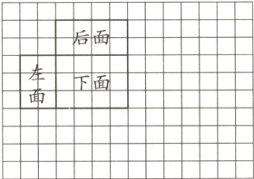 下图是一个无盖长方体纸盒展开图的后面、下面和左面(每个小方格的边长表示1分米)。请将纸盒的展开图补充完整,并计算出做这个纸盒至少需要多少平方分米纸板。