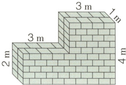 (1)$3×1×(4 - 2)+(3 + 3)×1×2 = 18$(立方米) 答:这段古城墙的体积是18立方米。(2)40厘米 = 0.4米 25厘米 = 0.25米 20厘米 = 0.2米 $18÷(0.4×0.25×0.2)=900$(块) 答:这段古城墙是用900块砖砌成的。