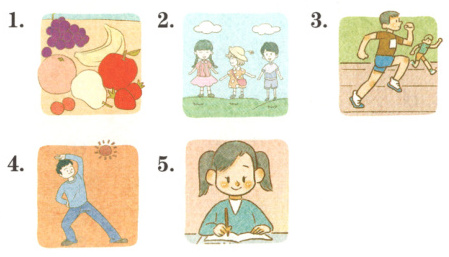 1.Fruit;good 2.with my friends 3.Running 4.you be healthy and strong 5.works hard