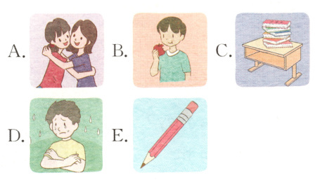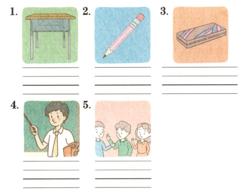 1. desk 2. pencil 3. pencil box 4. teacher 5. friends