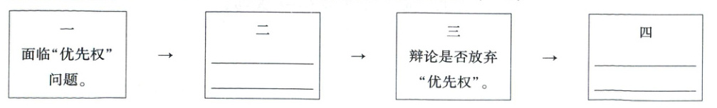 解析:题干提示“二”“四”空答案要分别从文章第二部分和第四部分中归纳。第二部分记述的内容是达尔文打算将自己的研究成果“付之一炬”并放弃优先权,他的妻子爱玛竭力劝说,最后达尔文决定听听赖尔、霍克的意见。由此可知“二”空可填:打算放弃“优先权”。第四部分记述的内容是在伦敦学术会上,赖尔宣布了两篇关于物种起源和变异方面的论文。由此可知“四”空可填:共享“优先权”。