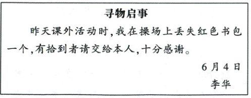 (1)活动开始前,李华同学丢失了自己的红色书包,下面是他拟写的寻物启事,有两处不妥,请你提出修改意见。(2分)