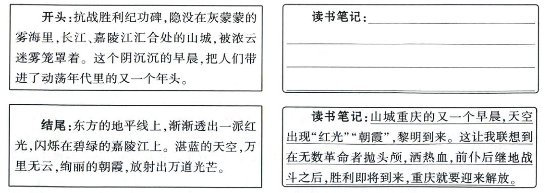 1.(示例)山城重庆的早晨,“迷雾”笼罩,天气阴沉。这让我联想到国民党统治下风雨如晦的社会环境,也让我联想到重庆解放前革命者面临严酷的斗争,他们将要为重庆的解放付出艰苦卓绝的努力。