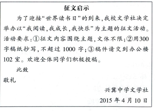 (1)“启示”和“启事”容易用错。“启示”意为“启发提示,使有所领悟”或“通过启发提示而领悟的道理”;“启事”意为“为了说明某事而登载在媒体上或张贴在墙壁上的文字”。这则应用文是为说明征文事宜而公开发布的文字,属于“启事”。