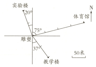 (1)实验楼在雕塑北偏西20°方向100米处;体育馆在雕塑北偏东75°方向200米处;教学楼在雕塑南偏东37°方向100米处。