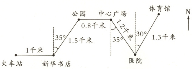 (2)1路公共汽车由中心广场向南偏( )( )°方向行( )千米到达医院,再向北偏( )( )°方向行( )千米到达体育馆。