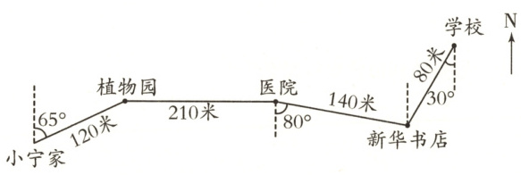 (1)小宁上学时,从家出发,先向( )偏( )( )°方向走( )米到达植物园,再向( )走( )米到达医院,又向( )偏( )( )°方向走( )米到达新华书店,最后向( )偏( )( )°方向走( )米到达学校。