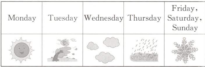 1. sunny 2. windy 3. Wednesday 4. rain 5. snow