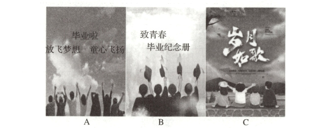 (3) 小悦同学为毕业相册设计了以下封面,通过比较下面A、B、C三幅图,你觉得哪一幅做封面最合适?请简单说一说你的理由。(5分)