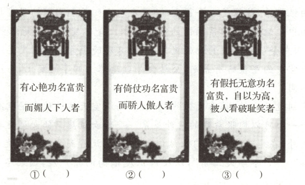 【解析】闲斋老人的《儒林外史序》说:“其书以功名富贵为一篇之骨。有心艳功名富贵而媚人下人者(如周进、范进、梅玖、牛浦郎);有倚仗功名富贵而骄人傲人者(如严贡生、汤知县、王惠太守);有假托无意功名富贵,自以为高,被人看破耻笑者(如杨执中、权勿用、杜慎卿、娄三、娄四公子);终乃以辞却功名富贵,品地最上一层为中流砥柱(如王冕、杜少卿、庄征君、虞育德)。”这是《儒林外史》中主要写的四类人。根据上述内容即可得出答案。
