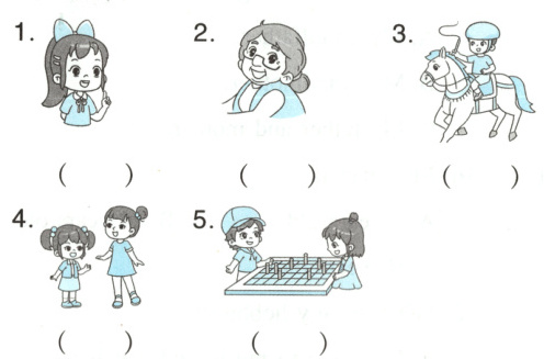 五、看图选择合适的短语并抄写在横线上,补全句子或对话。