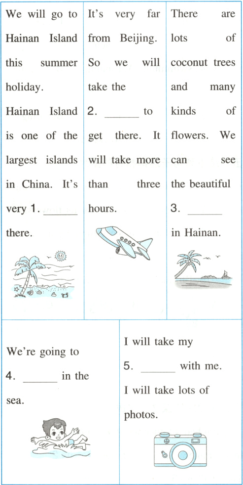 A. swim B. sandy beaches C. camera D. hot E. plane
