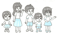 I am Linda. I am ten. I wear a pair of glasses. I have four cousins. Look at this photo of my family. The beautiful girl is Sue. She is two years older than me. She has big eyes and long hair. She is tall and thin. The shorter girl is her sister, Mary. Mary is three years younger than Sue. She has short hair and looks like a boy. The tall and strong boy is Jack. He is younger than Sue and older than me. He likes playing basketball. The short boy is his brother Tim. He is one year younger than Mary.