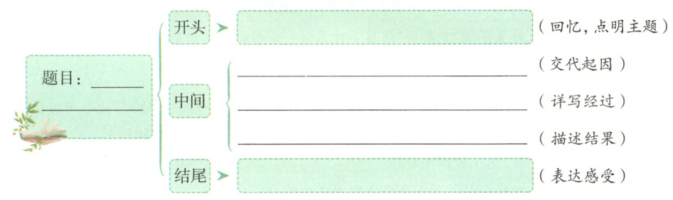 (示例)题目:《那一刻,我长大了》 开头:下雨天,想起妈妈接我放学的情景 中间:放学时下起大雨,妈妈骑电动车来接我 妈妈把雨披不停地往我身上拉,我悄悄把雨披推到妈妈身上 看到妈妈的衣服没有湿,我觉得自己长大了 结尾:我长大了,可以为妈妈遮风挡雨了