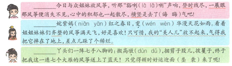 1.lā 晦 yān wén dūn 袭 2.D 3.风筝 4.B A D 5.形容人多手杂,动作纷乱 示例:手忙脚乱 人多手杂 不慌不忙 从容不迫 七嘴八舌 七拼八凑6.率性、纯真