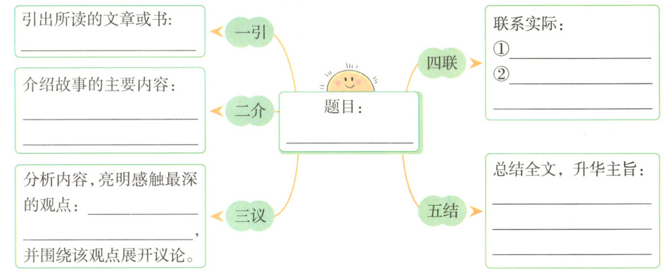 三、(示例)题目:《西游记》读后感 一引:《西游记》 二介:唐僧师徒几人经历了诸多磨难,终于取得真经的故事 三议:唐僧师徒几人在取经途中不畏艰难、顽强拼搏的精神打动了我 四联:①我国运动健儿在奥运赛场上顽强拼搏、奋勇争先 ②我克服困难爬上山顶 五结:只要坚持到底,就能战胜困难,取得胜利