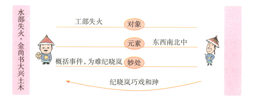 纪晓岚与和珅是一对冤家。某日早上,众臣正等待上朝,工部的金尚书跑过来告诉和珅,工部失火,损失严重,需要重建了。恰逢纪晓岚从旁边走过,和珅便想,何不出一联难难他。和珅便借这次工部失火之事出了一联:“水部(工部有时也称水部)失火,金尚书大兴土木。”很平常的火灾和灾后重建工作,被和珅一句话概括了。这上联的独特之处在于把金木水火土五行全加了进去,就事出联,不可谓不妙。和珅满以为会难倒纪晓岚。纪晓岚先端详了和珅一会儿,说:“和大人虽是北方人,但是面色白皙,与南方女子可媲美。”和珅以为他真的对不出了,正要嘲笑,纪晓岚随口说出了下联:“北人南面,和中堂什么东西?”和珅当即目瞪口呆,气得一句话也说不出来,这次又吃亏了。 (选自《纪晓岚巧戏和珅》,有删改)