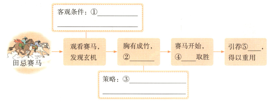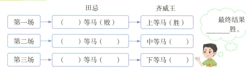 接着,第二场比赛开始了。田忌用上等马对齐威王的中等马,胜了第二场。②田忌微微一笑。