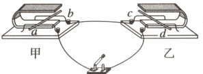 电动;左 【点拨】闭合开关,将金属杆ab水平向右移动,此时相当于闭合电路的一部分导体在磁场中做切割磁感线运动,故导体中会有感应电流产生,故甲装置的原理是电磁感应;此时甲相当于电源,cd相当于放入磁场中的通电导体,因此cd受力运动,故乙装置的原理是通电导体在磁场中受力运动,乙相当于电动机。若甲装置中金属杆ab水平向左移动,其他条件不变,则电流方向相反,乙装置中金属杆cd的运动方向与原来方向也相反,即金属杆cd会向左运动。