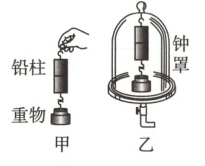 15. 科学思维 科学论证 用力将端面已锉平的两铅柱紧压在一起,然后将它们悬挂起来,并在下方挂一重物,发现两铅柱不分开(如图甲)。对此现象,小金有疑惑:两铅柱不分开是大气压力造成的还是其他引力造成的?于是小金将图甲所示的铅柱与重物固定在一个玻璃钟罩内(如图乙),逐渐抽出钟罩内的空气。