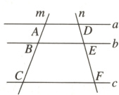 3. 如图,已知直线a//b//c,直线m分别交直线a,b,c于点A,B,C,直线n分别交直线a,b,c于点D,E,F,若$\frac{AB}{BC}=\frac{1}{2}$,则$\frac{DE}{DF}= $________.