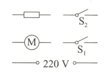 )、电风扇(─Ⓜ─)及开关。闭合开关S₁,电吹风即吹出风来;若同时还闭合S₂,吹出热风;若只闭合S₂,不吹风也不发热。请根据要求用笔画线代替导线,完成电路设计。