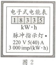 (40) A表示电能表的标定电流为5 A,电能表的额定最大电流为40 A,则电能表能接入用电器的最大总功率:P最大=UI最大=220 V×40 A=8 800 W。电饭锅消耗的电能:W=300/3000kW·h=0.1kW·h,即产生的热量为0.1kW·h=3.6×10⁵ J。