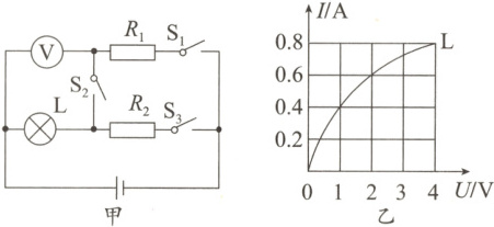 解析:由题图甲可知,当只闭合S₁、S₂时,R₁与小灯泡L串联,电压表测量小灯泡L两端的电压;由题图乙可知,当小灯泡两端的电压为2V时,通过小灯泡的电流为0.6A;根据串联电路的电流特点和欧姆定律可知,R₁两端的电压:U₁ = IR₁ = 0.6A×10Ω = 6V,根据串联电路的电压特点可知,电源电压:U = Uₗ + U₁ = 2V + 6V = 8V;当只闭合S₂、S₃时,R₂与小灯泡L串联,电压表测量小灯泡L两端的电压;根据题图乙可知,当小灯泡两端的电压为4V时,通过小灯泡的电流为0.8A,根据串联电路的电流特点可知,电路中的电流为0.8A,电路在1min内消耗的电能:W = UI't = 8V×0.8A×1×60s = 384J。