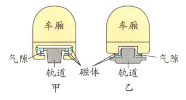 吸力式 根据异名磁极相互吸引的原理,如题图甲所示,轨道下方的磁体对倒转向上的车身磁体产生吸引力,将车身“吸”起来