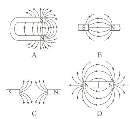 D 解析:磁体外部的磁感线都是从磁体的N极出发,回到S极;在A、B选项中,磁体外部的磁感线从磁体的S极出发,回到N极,故A、B错误;在C选项中,磁感线从左侧磁体的S极出发,故C错误;只有D选项中磁感线方向正确,故D正确。