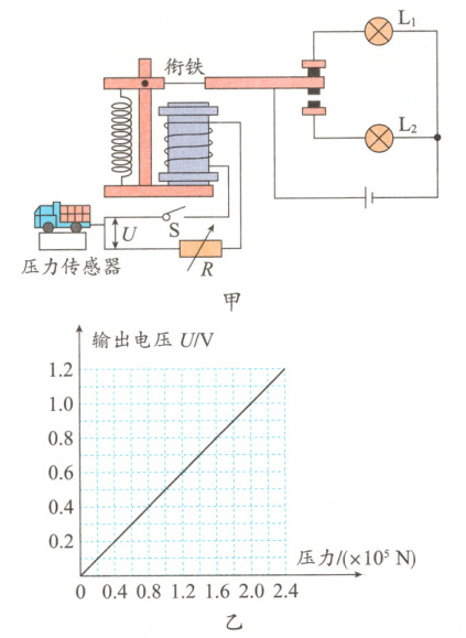 [名师讲习](1)由题图甲可知,车辆不超载时,动触点与上面的静触点接通,灯L1亮;车辆超载时,动触点与下面的静触点接通,灯L2亮,故灯L2是红灯。