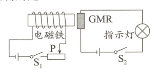 D解析:利用安培定则可知,电磁铁的左端为N极、右端为S极,故A错误;当滑片P向左滑动时,滑动变阻器连入电路中的电阻变小,根据欧姆定律可知,左侧电路中的电流变大,电磁铁的磁性增强,GMR的阻值变小,指示灯所在电路的总电阻变小,根据欧姆定律可知,通过指示灯的电流变大,灯变亮,故B、C错误,D正确。