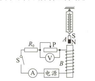 4如图所示,A是悬挂在弹簧测力计下的条形磁体,B是电磁铁。闭合开关S,将滑动变阻器的滑片P向右移动时,弹簧测力计的示数变小,则下列分析正确的是 ( )
