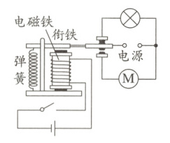 C解析:当闭合开关后,电磁铁产生磁性吸引衔铁,右半部分下落,弹簧被拉伸,弹性势能增大,故A错误;当闭合开关后,线圈相当于通电螺线管,根据安培定则判断电磁铁上端为N极,故B错误;当闭合开关后,电磁铁产生磁性吸引衔铁,右半部分往下落,开关与下面电动机所在的电路接触,电动机所在电路闭合,电动机正常工作,开关与上面灯泡所在的电路分离,灯泡所在电路断路,灯泡不发光,故C正确;电磁铁的工作原理是电流的磁效应,与电磁感应无关,故D错误。