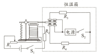 10(2023·苏州中考)寒冬,为给小鸡提供温暖的环境,小明制作了恒温箱系统,原理如图所示。控制电路由电磁继电器、滑动变阻器R₁、热敏电阻R₂(安装在恒温箱内,阻值随温度升高而显著减小)、低压电源等组成。加热电路由电源、电热丝R₃和R₄等组成。调好R₁阻值,闭合开关S₁、S₂,箱内温度升高到设定值后即在小范围内波动,且降温阶段降温比较平缓。