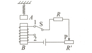 9子若同学利用如图所示装置研究电磁铁磁性的强弱与哪些因素有关。图中A是悬挂在弹簧下的铁块,B是电磁铁的铁芯,S是转换开关(S接1时电磁铁连入电路的线圈匝数多,S接2时电磁铁连入电路的线圈匝数少)。