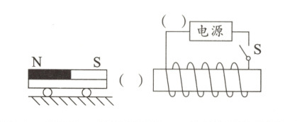 4. (梅州模拟)如图所示,闭合开关S,条形磁体因受磁力向右运动,请在图中括号内标出电磁铁左端的极性(用“N”或“S”表示)和电源左端的极性(用“+”或“-”表示)。
