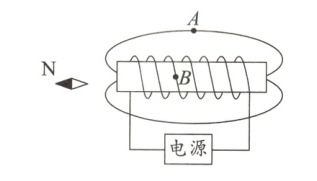 解析:根据小磁针静止时N极的方向可知,螺线管的左端为N极,右端为S极,由安培定则可知,螺线管中的电流从右端流入,左端流出,故B点的电流方向向上;磁感线在磁体外部总是从N极出发回到S极,故A点的磁感线方向向右,如图所示。