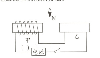 6. (锦州一模)如图所示,闭合开关后,两个通电螺线管中间的小磁针N极向下指。请你在括号内标出电源的“+”或“-”极,并画出乙通电螺线管的绕线方法。
