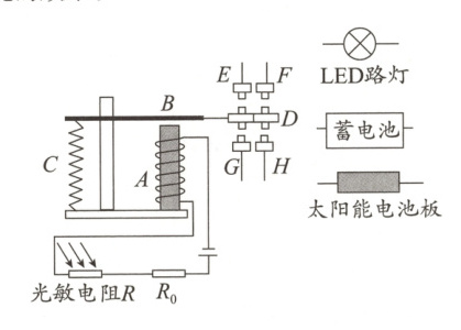 解析:白天光敏电阻变小,由欧姆定律可知,控制电路中电流变大,电磁铁吸引衔铁,动触点D与静触点G、H接触;要LED灯熄灭,则H接蓄电池,G接太阳能电池板,此时太阳能电池板给蓄电池充电。夜晚光敏电阻变大,由欧姆定律可知,控制电路中电流变小,电磁铁不吸引衔铁,衔铁向上弹起,动触点D与静触点E、F接触;要LED灯亮,则E接LED路灯,F接蓄电池,此时蓄电池对LED路灯供电。故设计电路如图所示。