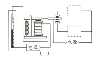 解析:由题意知,电磁铁上端为N极,根据安培定则知,电源的右端为负极,左端为正极;当温度低于设定温度时,安全指示灯常亮;当温度达到设定温度时,电磁铁有了磁性,吸下衔铁,断开安全指示灯电路,同时动触点向下移动,接通电铃电路,电铃发出报警信号;说明安全指示灯与上面的静触点连接,电铃与下面的静触点连接,指示灯和电铃并联,如图所示。