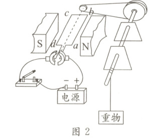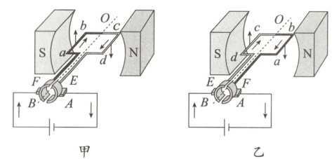 (2)图1中ab边所受磁场的作用力为F,把电源的正、负极对调再接入电路,闭合开关,线圈abcd转至图2所示位置,则( )