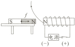 (3)根据磁极间的相互作用规律,通电螺线管排斥条形磁体,条形磁体相对桌面有向左运动的趋势,所以条形磁体的摩擦力向右。如答案图所示。