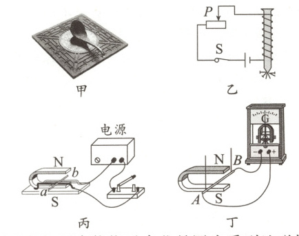 A 解析:因为地球是一个巨大的磁体,司南能够指示南北方向是因为受到地磁场的作用,故A正确;题图乙中,闭合开关后,向右移动滑动变阻器滑片时,滑动变阻器接入电路中的电阻变大,电路中电流变小,电磁铁的磁性会减弱,故B错误;题图丙中有电源,闭合开关后,通电导体在磁场中受力而运动,将电能转化为机械能,这是电动机的工作原理,故C错误;导体AB竖直向上运动时,运动方向与磁场方向平行,不能切割磁感线,不能产生感应电流,电流表指针不会发生偏转,故D错误。