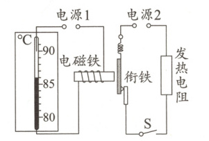 (1)水银是导体,当温度达到90℃时,水银柱接触到温度计上端的金属丝使电磁铁电路接通,此时电磁铁线圈中有电流通过,线圈中就会产生磁性,吸引衔铁,右端的电路断开,发热电阻停止加热。