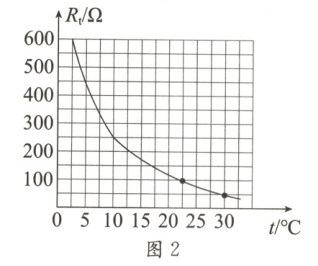 (2)由题图2可知,热敏电阻$R_t$的阻值随着温度t的升高而变小;若房间内部的温度为22.5℃,此时热敏电阻$R_t$的阻值为100Ω。
