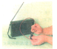 2(教材P150图21.2 - 2改编)如图所示,取一节旧的干电池和一根导线,靠近收音机,将导线的一端与电池的一极相连,再用导线的另一端与电池的另一极时断时续地接触。从收音机里听到了“咔嚓、咔嚓”的声音,这个现象反映了迅速变化的电流能在周围的空间中产生_______。如果把收音机放入一个密闭的金属容器中,进行同样的操作,_______(选填“能”或“不能”)听到“咔嚓”声,这说明密闭的金属容器能_______电磁波。